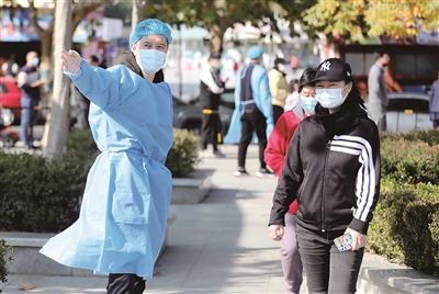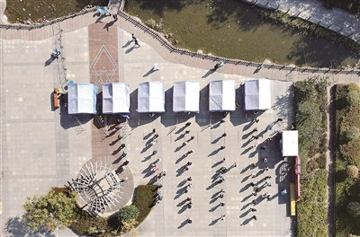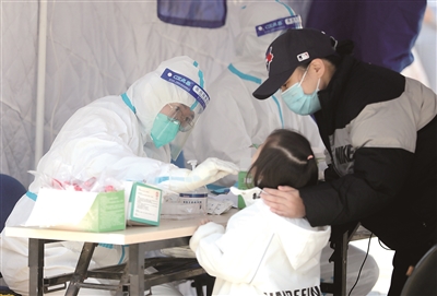 ■在市北区洛阳路街道海琴广场核酸检测点,医务工作者、志愿者、市民相互配合核酸采样,用行动守护共同家园。图一为市民排队核酸检测。图二为志愿者维持现场秩序。图三为医务工作者开展核酸采样。 韩星 摄