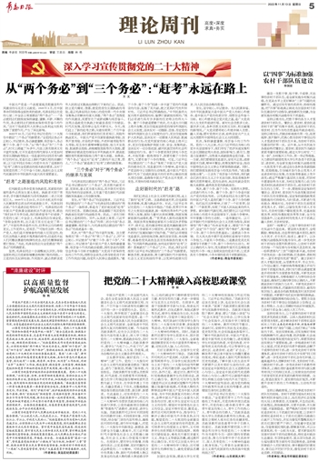 习近平总书记在党的二十大报告中提出,“全党要把青年工作作为战略性工作来抓,用党的科学理论武装青年,用党的初心使命感召青年,做青年朋友的知心人、青年工作的热心人、青年群众的引路人。”思政课是高校大学生思想政治教育的主阵地,是落实立德树人根本任务的关键课程,思政课教师肩负着青年学子引路人的重任。思政课教师要把深入学习领会和向学生传授党的二十大精神作为当前和今后一段时期的首要政治任务,努力引导青年学子在系统学习、深入思考党的二十大精神的基础上躬身实践,“让青春在全面建设社会主义现代化国家的火热实践中绽放绚丽之花”。