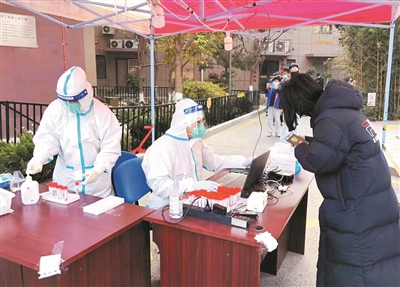 在内蒙古路社区防疫一线,由夏娜娜带领的数位巾帼志愿者,奋战在核酸检测服务、入户采样、电话随访等防疫岗位;在上四方社区,张妍和高原“夫妻档”忙碌在一线;在丰盛路社区,五十多岁的老党员肖国青担当起检测点位的“总管家”,提着喇叭,穿梭在核酸检测点、小区楼院……