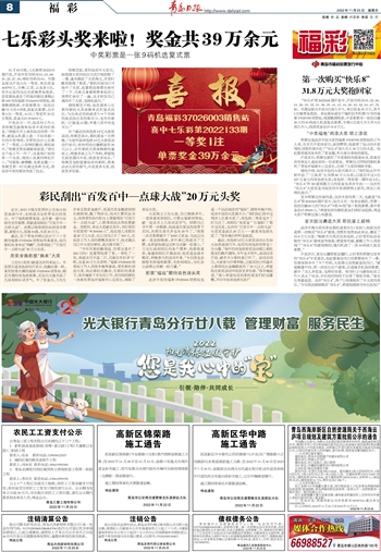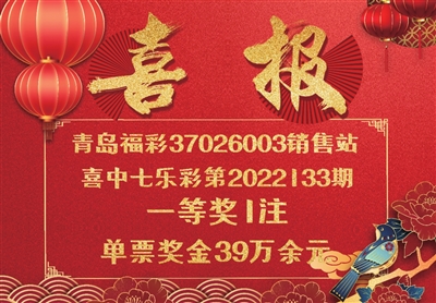 11月18日晚,七乐彩第2022133期开奖,开出中奖号码为01、03、08、21、22、27、30,特别号码为04。当期全国共开出3注一等奖,单注奖金368793元,吉林、江苏、山东各1注。其中山东的这注头奖被青岛揽获,获奖彩站是位于西海岸新区喜鹊山路109号的福彩37026003销售站,根据数据检索,中奖彩票为一张投注额72元的9码机选复式彩票,共中得1注一等奖、14注三等奖和21注五等奖,奖金共计394833元。