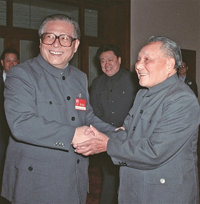 1989年11月6日至9日,中国共产党第十三届中央委员会第五次全体会议在北京召开。这是邓小平同志和江泽民同志亲切握手。