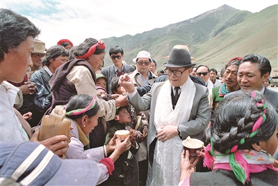 1990年7月25日,江泽民同志与藏族群众共庆望果节。