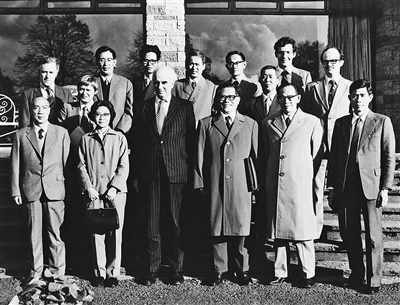 1964年6月,江泽民同志(二排右一)在法国艾克斯莱班出席国际电工委员会会议期间同与会代表合影。