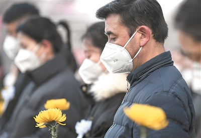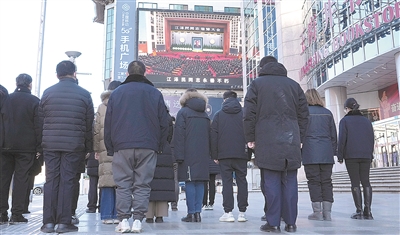 在新疆乌鲁木齐市街头,群众肃立默哀。
