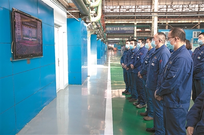 在哈电集团哈尔滨电机厂有限责任公司,职工收看江泽民同志追悼大会直播。