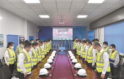 在河南郑州中原数字产业园(西园)项目工地,中建三局的建设者肃立默哀。
