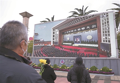 在江西南昌八一广场,群众收看江泽民同志追悼大会直播。