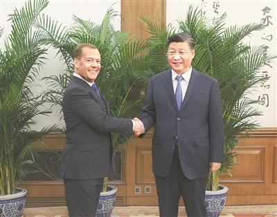 习近平请梅德韦杰夫转达对普京总统的亲切问候和良好祝愿,指出中共二十大明确了全面建成社会主义现代化强国、以中国式现代化全面推进中华民族伟大复兴的中心任务。我们有充足底气、充分信心走好中国式现代化之路,也为世界和平与繁荣提供更多机遇。中国共产党和统一俄罗斯党长期开展机制化交往,成为巩固中俄政治互信、推进两国互利合作、展现两国战略协作的独特渠道和平台,为新时代中俄关系行稳致远提供了有力支撑。当前,中俄执政党交往迈入“第三个10年”。希望两党继续围绕治国理政经验、促进发展战略对接、推动政党国际多边合作等深入交流,就执政党建设互学互鉴,为深化中俄全面战略协作贡献智慧和力量。