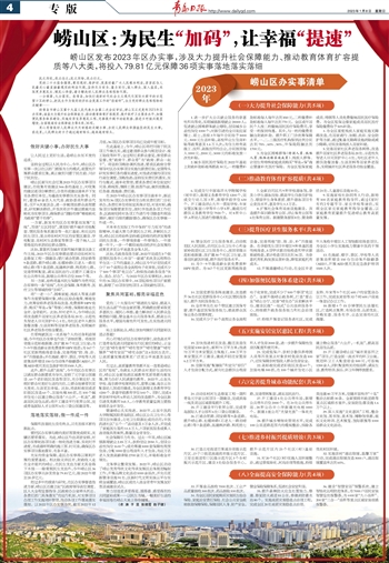 ~~~崂山区发布2023年区办实事,涉及大力提升社会保障能力、推动教育体育扩容提质等八大类,将投入79.81亿元保障36项实事落地落实落细
