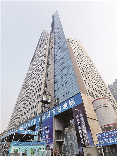 在市南区香港中路80号涉外法务中心大厦的建设现场,室内室外十余部电梯在地面与241.85米高空中日夜穿梭,不停歇地运输建设工人和施工物料。两个高层建筑施工吊篮内,几名工人相互配合,正在仔细地安装一块玻璃幕墙。这座65层的超高层建筑,共有玻璃幕墙1900余块,全部采用双银Low-e、中空、超白等最高品质玻璃,经过反复的调试、测量、流程磨合,玻璃幕墙安装时间已经从初试期的一个周安装1块,提速到一天安装13块。在后续项目物料供应链逐步恢复、建设工人全部到位后,速度有望提高到一天安装40块。