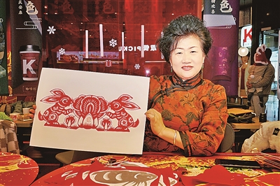 “这幅作品名字叫《大展宏兔》,采用传统的左右对称构图形式和阳剪技法,画面中间的玉兔夫妻簇拥着一株硕大的白菜,谐音‘百财’,花枝上悬挂着代表万事如意的中国结,花朵间是象征美好爱情的蝴蝶。两只玉兔喜笑颜开,头插红花,手持‘国泰民安’条幅,向人们送上新年的祝福。玉兔中间是钱串、元宝和蝙蝠,象征财源滚滚、家庭幸福。下方盛开的牡丹花寓意富贵吉祥、前程似锦。”兔年将近,作为崂山区新时代文明实践家庭站的代表,崂山剪纸非遗文化传人、新时代文明实践志愿者苏霞用“纸上传情”的方式,创作了“双兔送福”“玉兔迎春”“奔跑的兔子”等众多迎春作品,表达新年祝福。此外,她还开设剪纸小课堂,将崂山剪纸这门传统技艺传承给更多孩子。