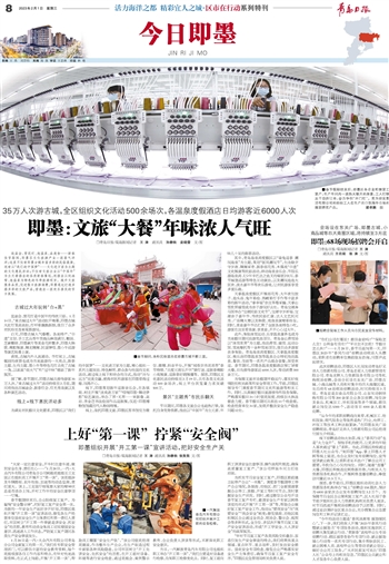 逛庙会、赏花灯、泡温泉、品美食……新春佳节期间,即墨区文化旅游产业一派喜气洋洋:这里不仅有即墨古城丰富多彩的民俗展演,还有以“我们的中国梦”——文化进万家为主题的文化惠民活动;不仅有文旅企业以“中国年”为主元素推出的各类新春策划,还推出以玩冰雪、泡温泉为特色的冬季旅游项目。提升文旅服务品质,促进假日旅游消费,即墨通过打造多姿多彩的文旅产品,营造出一派欢乐喜庆的节日氛围。