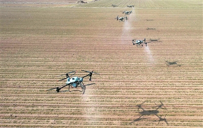 9台无人机一字排开,桁架式自动喷灌机、植保机等田间“大块头”同步进行镇压、划锄、浇水、施肥……8日上午,由市农业农村局组织的春管春耕备耕工作会在平度市田庄镇举行。