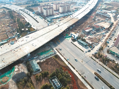 24日下午,记者在深圳路节点桥处看到,桥面上方工人们正在绑扎钢筋,而桥面下方的临时支撑体系正在拆除,目前贝雷梁已经拆除完成,后续还将把钢管柱及临时混凝土基础全部拆除。“待拆除后,整个跨深圳路的桥下空间内没有一根墩柱,十分通透,进而减少往来车辆的视线遮挡。”李福泽说。