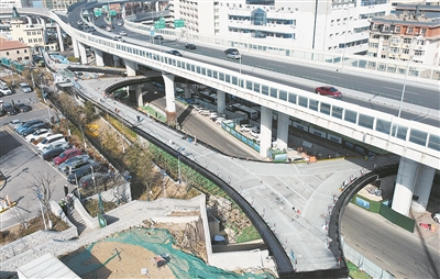 此外,缝合连接大鲍岛文化休闲街区与上海路-武定路历史文化街区的浮岛公园也已完成主体施工,桥体初现雏形,工人们正在加紧样板段饰面铺装。
