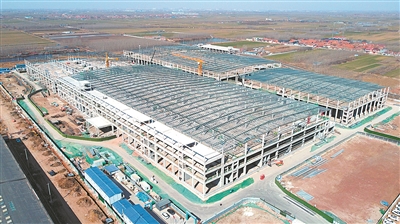 空中俯瞰,7000余根钢筋檩条“星罗棋布”,勾勒出厂房“穹顶”;1700余根钢筋混凝土柱犹如“行兵列阵”,撑起30余万平方米的巨型厂房……