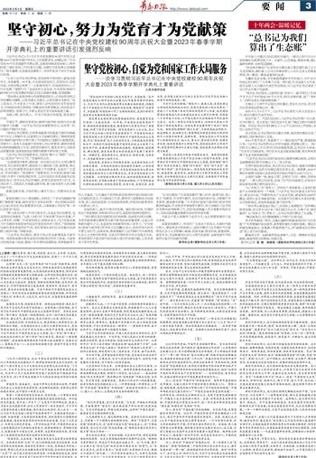 习近平总书记3月1日在中央党校建校90周年庆祝大会暨2023年春季学期开学典礼上的重要讲话,回顾总结了中央党校90年历史成就和光辉业绩,全面深刻阐述党校初心,科学回答了做好党校工作的重大问题,为新时代党校事业发展提供了根本遵循,在各级党校教职工、学员和党员干部中引发强烈反响。