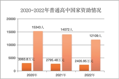 2022年,为10899名普通高中家庭经济困难学生发放国家助学金,财政投入2212.35万元;为1210名原建档立卡等家庭经济困难学生免除学杂费193.6万元。