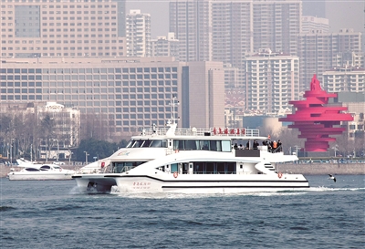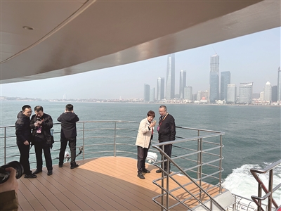 3月27日上午,参加省旅发大会的嘉宾、媒体记者代表组成的体验团,从奥帆中心乘游轮出发,以游客视角体验青岛独具魅力的“海上名山”旅游线路。