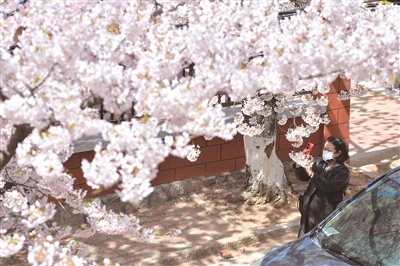 ■四月青岛,樱花季如期而至。市南区三明南路两侧十多株樱花陆续绽放,形成一条深藏在居民区里的樱花路。据了解,三明南路上的樱花树种植于1987年左右,已有36年的树龄。图为市民在樱花盛开的三明南路上拍照留念。于 滈 摄影报道