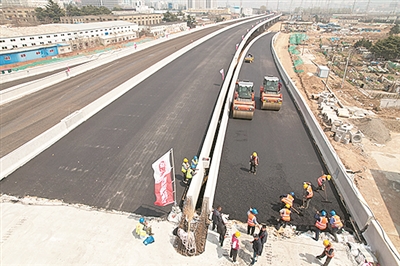 本报4月9日讯 在轰鸣声中,冒着热气的沥青混合料源源不断地从一辆辆翻斗车中流入摊铺机内,随后摊铺机将滚烫的沥青均匀铺开,压路机对路面进行反复碾压,工人们将多出的沥青火速铺平,一条平坦宽敞的柏油大道渐渐呈现在眼前。9日上午,这一幕发生在跨海大桥高架路二期工程首段沥青摊铺施工现场。本次摊铺位于深圳路以东主线桥梁及双侧平行匝道,主线桥摊铺长度450米,标准横断面宽度26.15米。沥青摊铺的开展,标志着项目已进入最后冲刺阶段。