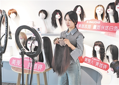 在直播间展区,数十款长短、造型、风格不同的假发整齐地摆放在展架上。“根据材质,价格从上千元到上万元不等。比如这顶用真人头发制作的假发,价格在万元以上。一般的化纤假发戴久了之后会让人不舒服,这款完全不会有这种不舒适感。”Kavin告诉记者,这种高端假发一般都由海外客户私人订制,会根据对方的头型等数据“一比一”制作,从原料到成品至少四十多道工序,全程手工制作,成本高,佩戴效果自然逼真。