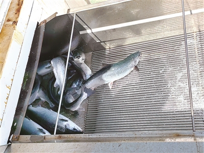 彭勇介绍,收鱼主要分为工船靠泊网箱,潜水员聚鱼、下管道,吸鱼到加工车间、分离鱼水,电击平台击晕后割鳃,通过旋转降温池降温,装箱上路及陆上加工几个步骤。“目前网箱内还有5万余尾,今天共收两网,计划收鱼约3000尾,可装80箱左右。”
