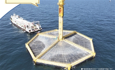 在记者抵达“深蓝1号”所在海域时,网箱已经上升到水面之上,网箱外部的网衣挂满了黑色的贝类。网箱中间的立柱上,标注60米的刻度清晰可见,顶部则是盛放饲料的料仓及相关监测设备。据悉,“深蓝1号”作为全潜式装备,可以根据天气变化通过注水注气实现下潜或上浮。