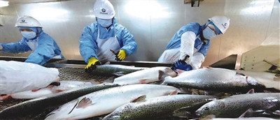 转运箱内的鱼,泛着明亮的银色光泽,显得新鲜异常。“这条鱼有7公斤,市场价格在一千多元。”彭勇捧起一条丰腴的大西洋鲑鱼兴奋地说。工作人员忙不迭地加工装箱,现场一片繁忙。
