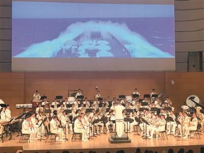 当日晚7点半,庆祝人民海军成立74周年大型交响管乐音乐会《巨浪》在青岛大剧院精彩上演(右图)。一首首慷慨激昂的曲目,将演出推向一个又一个高潮,引发现场观众阵阵热烈的掌声喝彩。 刘佳旎 余博 摄影报道