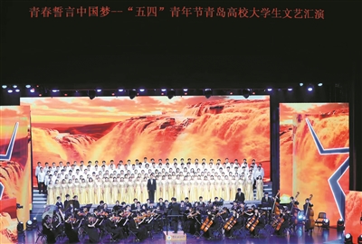 文艺汇演在气势恢宏的交响乐曲《我的中国心》《保卫黄河》中拉开序幕。《时光不朽 青春无悔》用情景剧、舞蹈、合唱等形式,讲述了从1919年“五四运动”到和平年代,一代又一代年轻人保家卫国、青春无悔的动人故事;音诗画《青春的模样》则述说着从革命年代到新中国成立初期,从改革开放到新时代,青年人用奋斗、坚守、忠诚诠释青春,在时代风口御风前行,与青岛这座城市发展共融共生的奋斗往事;歌曲联唱《青春集结》唱出了当代青年的果敢气魄,更唱出了他们对祖国最深情的告白;歌舞《最美华夏》是一组国风浓郁的学生原创作品,从优秀传统文化中汲取创新力量,让中华经典的千年风韵与现代时尚艺术完美结合;中国海洋大学原创歌曲《子曰》与青岛职业技术学院学生设计的国风服饰同台展示,展现了当代大学生的想象力、创造力,更彰显了新时代青年的文化自信和民族自信。