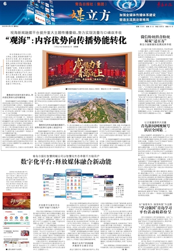 观海新闻融媒平台通过报网融合、与纸媒差异化选题,强化《青岛日报》品牌能见度,扩大集团报道的传播力、影响力。观海新闻融媒平台制作的《浮山,与青岛相拥》宣传片全网阅读量超320万;在抖音、微博开设#五月嗨玩青岛、#在青岛爬山游园两个话题,分别揽获1484万、252万阅读量。