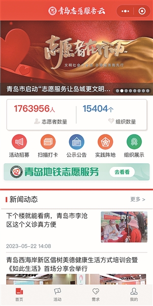 志愿云服务平台,是智慧同城在青岛市文明办指导下开发的青岛市志愿者服务平台,具备注册、发起活动、打卡、记录时长、队员管理、数据导出、信息展示等功能,该平台注册志愿者176万、志愿组织1.5万。