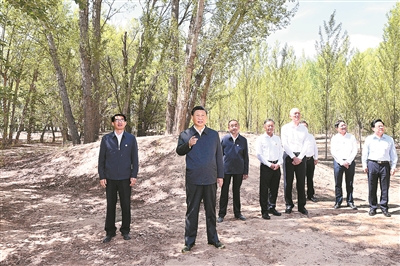 6日上午,习近平来到临河区国营新华林场,了解“三北”防护林体系工程建设情况。自1978年起,该林场大力治理耕地盐碱化造成的土地沙化问题,累计造林3.9万亩。在林场,习近平听取内蒙古“三北”工程建设和林场治沙造林情况介绍,并实地察看正在治理的沙地。习近平强调,人类要更好地生存和发展,就一定要防沙治沙。这是一个滚石上山的过程,稍有放松就会出现反复。像“三北”防护林体系建设这样的重大生态工程,只有在中国共产党领导下才能干成。三北地区生态非常脆弱,防沙治沙是一个长期的历史任务,我们必须持续抓好这项工作,对得起我们的祖先和后代。林场的工作很辛苦,也很有成效,要继续做好。科研工作者要把论文写在大地上,把实践中形成的真知变成论文,当党和人民需要的真博士、真专家。