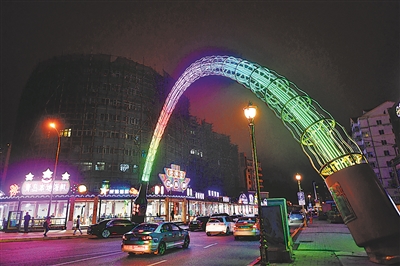 台东的“恣儿街”上,流光溢彩的霓虹灯牌下人头攒动,老北京爆肚、捞汁海鲜、炒酸奶等美食云集,俘获了食客的味蕾,攫住了行人的脚步。特色小店外排起长队,食物飘散的香气和人声鼎沸的喧闹声,勾画出市北热腾腾的烟火气。整修一新的过街天桥,成为游人驻足打卡的绚丽一景。拱桥呈“八”字回环,在霓虹的照映下,如同一条跃上夜空的光影彩带,站在上面俯瞰车水马龙,如梦似幻。