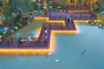 ■浮山森林公园盛装归来后,成为市民游客亲近自然的好去处。公园桃花坞节点沿湖建设了长廊、栈道、拱桥,白鹅、野鸭、黑天鹅等小动物为这里增添了灵气,一幅人与自然和谐相处的美丽画卷徐徐展开。 于滈 摄影报道