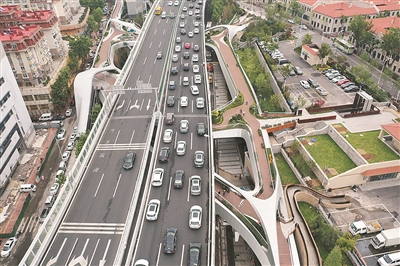 从空中俯瞰,在胶宁高架桥和沧口路之间,一条银色的“飘带”呈现在眼前,灵动飘逸、美感十足。这是青岛历史城区首个集“交通+景观+体验”于一体的大型基础设施——浮岛公园。