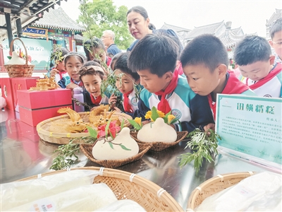 ■小学生在活动现场参观即墨非物质文化遗产“田横糈糕”。
