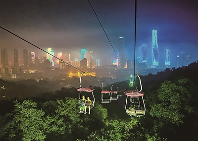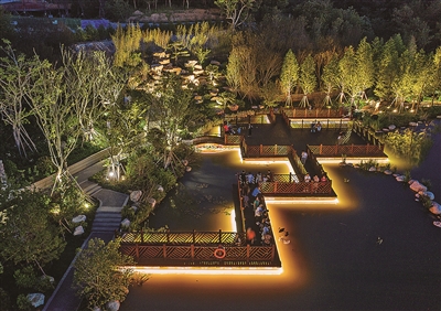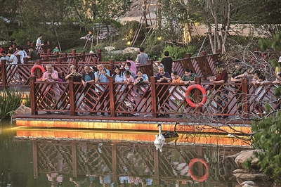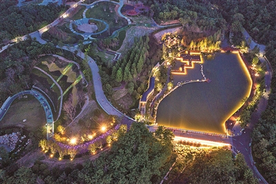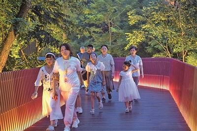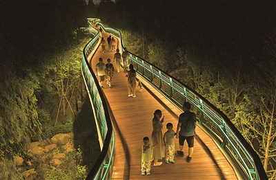 同样在夜色中“展开”绚丽画卷的,还有主城区的另一处“绿肺”——太平山中央公园。在榉林公园园区,蜿蜒而行的彩虹桥向山林深处延展。灯光映衬下,72种颜色交互渐变,如梦如幻,犹如一条在山间舞动的彩带。而在延安一路附近,一座全长约530米的景观桥又是另一番风采,人们或漫步或休憩,静谧美好,宛若人在画中游。