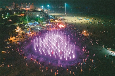 ■仲夏时节白天酷热难耐,夜幕下的滨海一线成为市民和游客消暑纳凉的胜地。除了洗海澡、吹海风之外,品尝美食、沙滩露营、观看街头演出和喷泉表演等极大地丰富了人们的游玩体验。随着青岛“夜”态的不断丰富,夜游青岛已成为一种全新的旅游体验。图为市民和游客在石老人海水浴场欣赏绚烂多彩的喷泉表演。 于滈 摄影报道