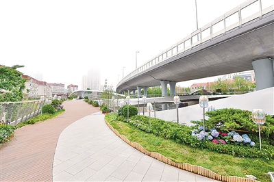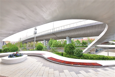 如果说浮山森林公园以自然景色驰名,位于胶宁高架桥和沧口路之间的浮岛公园则凸显了“一桥飞架南北”的巧思。它将人行系统与“空中花园”融为一体,宛如一条银色的“飘带”灵动飘逸。桥体的纵横双向均设计为流线型,实现了人行道路、绿化花园、城市景观的多功能有机统一。绿树环合,香花萦绕,随手一拍便出“大片”。桥体上部还设置了智慧灯杆、智慧屏、多功能音响、透明电梯等设施,让市民切身感受到老城更新带来的便利。