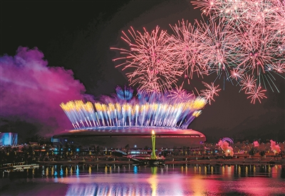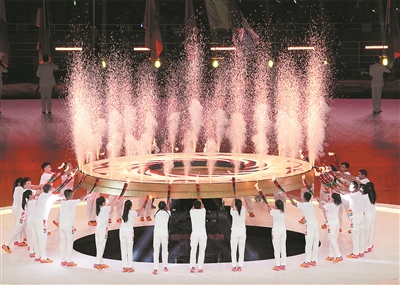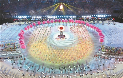 主火炬塔的火焰熊熊燃烧,照亮了全人类追求和平与发展的共同愿望,照亮了构建人类命运共同体的共同梦想!