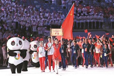 伴随着熟悉的《好一朵美丽的茉莉花》旋律,清华大学排球运动员胡朕卓和西南大学网球运动员郭涵煜共擎五星红旗,引领着中国代表团入场。400余名中国大学生运动员将参加全部18个大项的比赛。他们来自25个省区市百余所高校,平均年龄22.9岁。