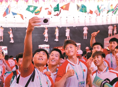 合着由大学生乐队现场演奏的音乐节奏,大学生运动员们入场了,全世界青年健儿在蜀绣铺就的锦绣之路上,去追寻他们的锦绣前程。成都的夜空下,年轻人彼此问候、热情相拥、与憨态可掬的“蓉宝”合影留念,欢声笑语随夜风飞扬……