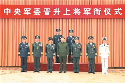 晋衔仪式在嘹亮的军歌声中结束。随后,习近平等领导同志同晋升上将军衔的军官合影。