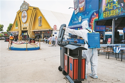 按照要求,专门消杀人员配备防护装备对特定区域开展消杀工作,垃圾中转站及卫生间每天6次消杀,办公区、大篷区、雨水箅子等每天至少3次消杀。本届啤酒节把大篷区、木屋区防疫消杀和垃圾集中及时清运作为工作重点,除了每天对公共区域展开至少3次消杀之外,还随时擦拭消毒游客休息区,并出动5辆洒水车冲洗路面泥沙脏污,垃圾随产随清,保证啤酒城的干净整洁。