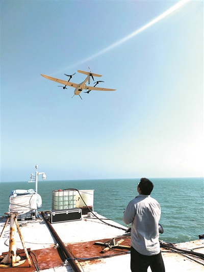 还有更多的无人机参与战斗。“在向阳红51、向阳红52两艘千吨级监测船以及近海陆地上,我们还安排了5架垂直起降固定翼大型无人机开展飞行任务。”自然资源部北海局高级工程师温若冰说,无人机如同“战场上的眼睛”,通过高频次、大范围巡航监测,为掌握浒苔最新分布情况、服务精准打捞工作提供着关键的第一手信息。