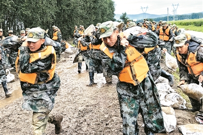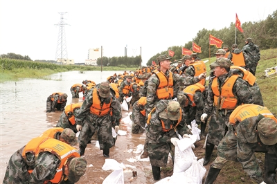 ■8月5日,陆军第78集团军某旅官兵在黑龙江齐齐哈尔市碾子山区地域加固岸堤。 新华社照片