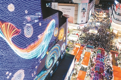 夜景是台东步行街的一大亮点。近日,记者在台东步行街看到,随着改造工程的推进,新设置的楼体亮化灯光呈现出海底世界的景象,为夜晚的台东增色不少。除楼体亮化外,天幕亮化也是本次改造加入的“新鲜事物”。
