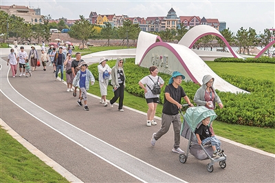 城市更新对空间的营造,以人的融入为最佳生态。浮岛公园,创新呈现了集“交通、景观、体验”于一体的“空中花园”,以独具创意的空间转化,激活了老城空间,贯通了城市文脉,方便了市民游客通行。无独有偶,承载着工业文明记忆的后海,也早已在城市更新中涂抹上“多巴胺”色彩。在欢乐滨海城海岸运动、阅读,已是很多市民熟悉的日常。